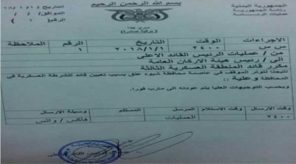 وجهت عمليات مكتب الرئيس القائد الاعلى للقوات المسلحة رئيس الاركان العامة بعودة قائد الشرطة العسكرية في شبوة من عتق الى مأرب بشكل فوري.