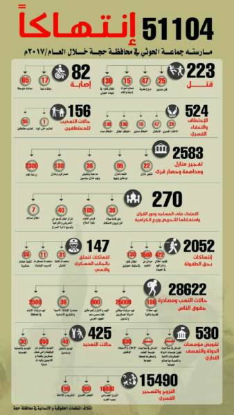ارتكبت ميليشيا الحوثي 51104 انتهاكات بحق مواطنين يمنيين في محافظة حجة خلال عام 2017، بحسب ما أفاد تقرير صادر أمس (الجمعة) عن ائتلاف المنظمات الحقوقية في المحافظة.