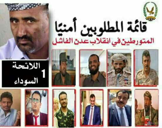 وتحتوي القائمة المذكرة على صور واسماء يعتقد بتورطهم في اعمال شغب وقتل ومحاولة انقلاب على الحكومة الشرعية احبطتها قوات الجيش الوطني والوية الحماية الرئاسية بالعاصمة المؤقتة عدن يوم امس الاحد بدعم من قوات التحالف العربي.