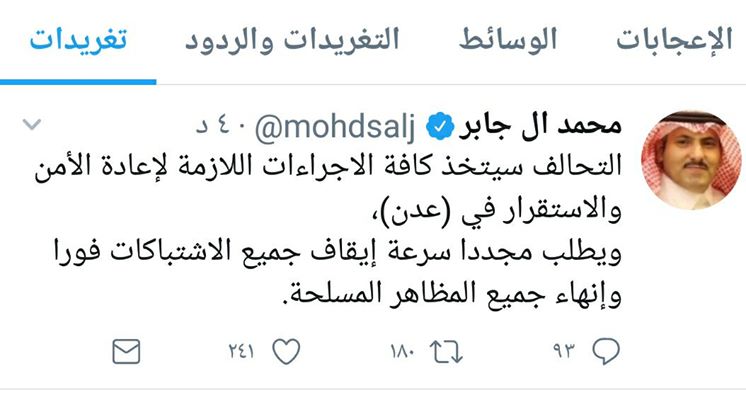 وفي تغريدة بحسابه الرسمي على تويتر قال ” محمد آل جابر ” الذي زار عدن قبل أسبوع ” التحالف سيتخذ كافة الاجراءات اللازمة لإعادة الأمن والاستقرار في (عدن)،