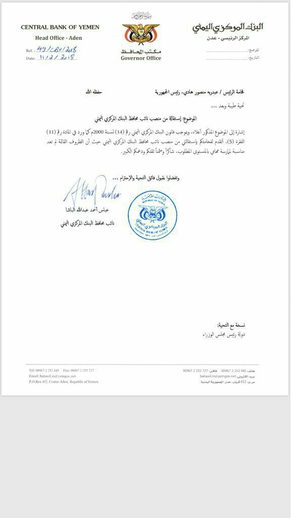 وبرر نائب المحافظ عباس الباشا، في خطاب الاستقالة الموجه الى الرئيس اليمني عبدربه منصور هادي -قرار استقاله بقوله :”إن الظروف القائمة لم تعد مناسبة لممارسة مهامه بالمستوى المطلوب”.