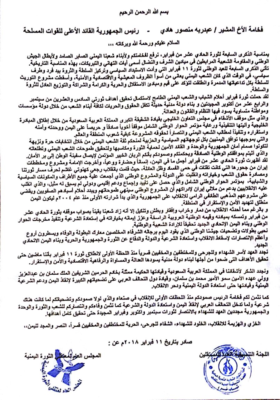 بمناسبة الذكرى السابعة لثورة الحادي عشر من فبراير، نرفع لفخامتكم ولأبناء شعبنا اليمني الصابر الصامد ولأبطال الجيش الوطني والمقاومة الشعبية المرابطين في ميادين الشرف والنضال أسمى أيات التهاني والتبريكات، بهذه المناسبة التاريخية.