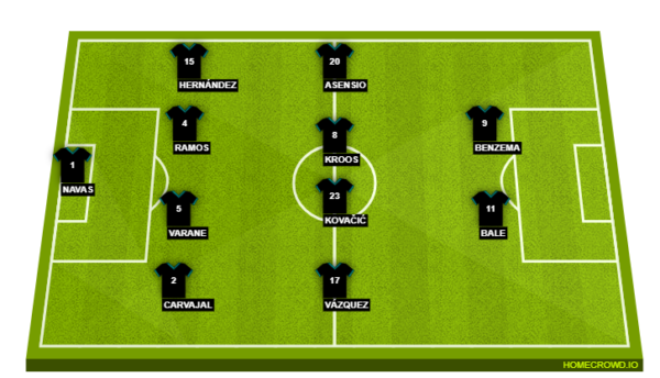 كما من المتوقع ان يغيب ايسينسيو ، ويبدأ زيدان تشكيلة خط الوسط بلوكا مودريتش وكاسيميرو إلى جانب فاسكيز وكوفاسيتش.