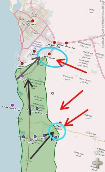 نشر الصحفي بسيم الجناني خريطة أعدها الاعلامي محمد مهيوب توضح المنطقة التي تتقدم فيها القوات المشتركة في الجنوب الغربي لمدينة الحديدة وسور مطار الحديدة.
