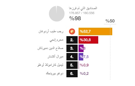 وجاءت نتائج فرز نحو 98% من أصوات الناخبين الأتراك، حصول الرئيس التركي، رجب طيب أردوغان على 52.7% من مجموع المصوتين، فيما حصل أبرز منافسيه محرم إنجيه على 30.7%.