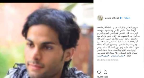 ونشرت اصالة صورة للفنان اليمني جلال السعيدي عبر حسابها على “إنستغرام” وعلقت عليها: “حبيبي الغالي جلال السعيدي الذي أضحك ملايين النَّاس وأدهشهم بموهبته الفريدة ,قُتل بالأمس في اليمن الحزين الجريح بأيدي من لا يخافون حتّى الله… أدعوا له بالرحمة والمغفرة”.