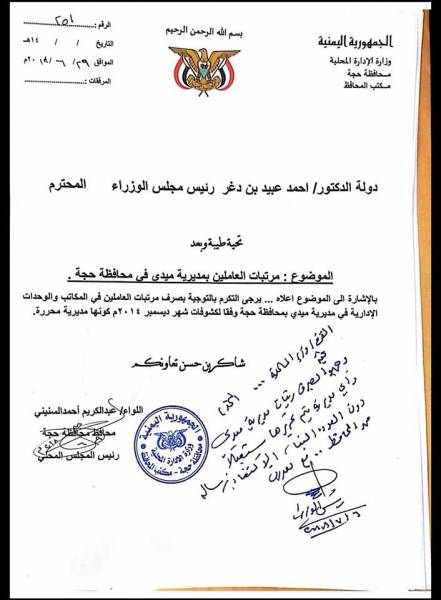 وجه رئيس مجلس الوزراء أحمد عبيد بن دغر بصرف رواتب الموظفين في المناطق المحررة بمحافظة حجة، شمال غرب اليمن.