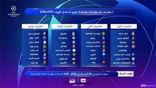 تقام مساء اليوم الخميس 30 اغسطس 2018، في بث مباشر قرعة دور المجموعات لدوري ابطال اوروبا للموسم الكروي 2018/2019، بمشاركة 32 فريق يتم تقسيمهم على 8 مجموعات.