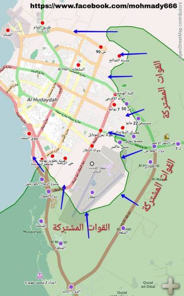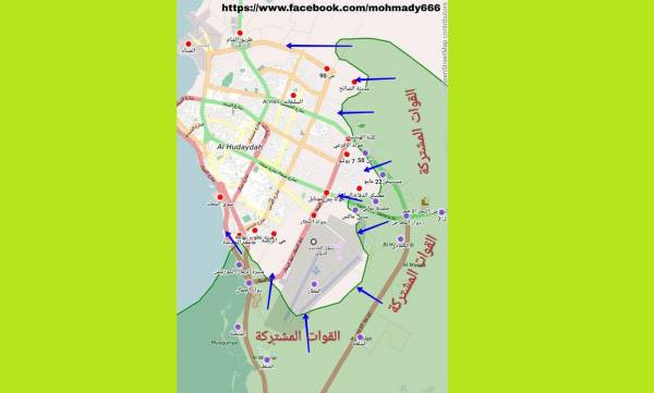 نشر الصحفي محمد مهيوب خريطة تبين تقدم القوات المشتركة لتحرير مدينة الحديدة الساحلية غرب اليمن ، وكيف تمكنت من تطويق المدينة بشكل شبه كامل.