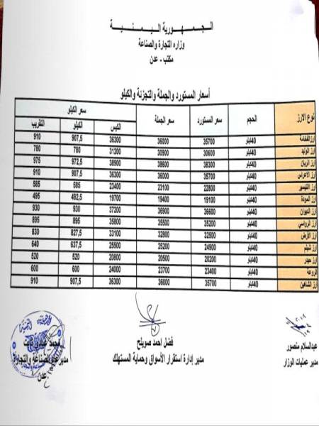 بالتزامن مع التحسن الكبير لأسعار صرف الدولار الامريكي مقابل الريال اليمني، اعلن مكتب التجارة والصناعة بمدينة عدن ، جنوب اليمن، قائمة جديدة تحدد أسعار مادة الأرز.