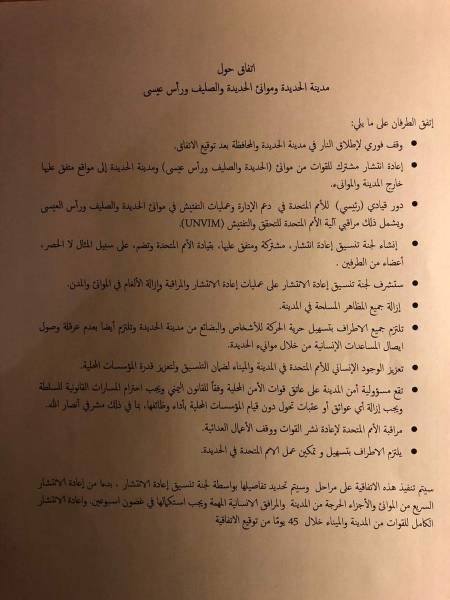 شاهد.. تسريب وثيقة اتفاق بين الحكومة الشرعية والمليشيا حول مدينة الحديدة