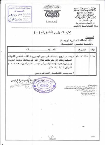 جاء ذلك في أمر عملياتي بعثه وزير الدفاع محمد علي المقدشي.الى قيادة المنطقة العسكرية الرابعة وقيادة محور الحديدة بوقف اطلاق النار في “محافظة ومدينة الحديدة وموانئ الحديدة ورأس عيسى والصليف اعتباراً من الساعة (منتصف الليل) من تاريخ 18/12/2018م”.