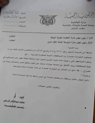 تناقل ناشطون اليوم الأربعاء عبر وسائل التواصل الاجتماعي وثيقة “مزورة” تقر بمنح الهجرة والجوازات التابعة للحكومة الشرعية ميلشيا الحوثي الانقلابية رسميا حرية وقانونية التنقل والسفر بنسخ الجوازات الصادرة من العاصمة صنعاء وسط البلاد.