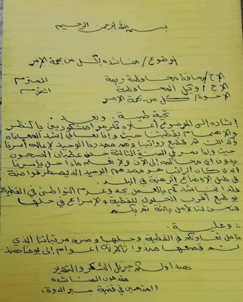 بعث المتهمون في قضية الشهيد جبر الدوه الثلاثة عشر سجينا من ابناء ريمة بمناشدة عاجله الى السلطة المحلية بمحافظة ريمة وعلى رأسهم محافظ المحافظة اللواء محمد الحوري ووكيل المحافظة الاستاذ محمد العسل والى كل من يهمه الامر بالسعي في حل القضية وصرف مرتابتهم.