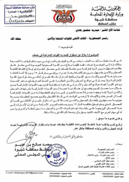 رفع محافظ محافظة شبوة محمد صالح بن عديو بلاغا هاما للرئيس هادي بشأن تحركات الإمارات في المحافظة.