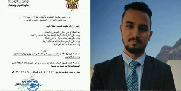 صدر اليوم قرار رئيس وزراء حكومة شباب وأطفال اليمن محمد عبدالله جميع رقم «٥٦» لسنة ٢٠١٩م بشأن تعيين نائبا لوزير التخطيط والتعاون الدولي بحكومة شباب وأطفال الشرعية.