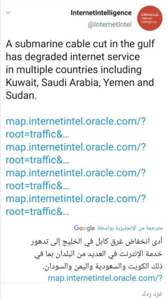 وقال الصحفي بسيم الجناني في منشور على صفحته بالفيسبوك انه :”فيما يخص إنقطاع وبطئ الإنترنت في اليمن ، مرفق لكم تغريدة تؤكد فعلاً مشكلة الكابل البحري وتضرر الإنترنت في عدد من الدول منها اليمن ، الفرق أن تلك الدول لديها مصدرين للإنترنت مثل كابل بحري متصل بجيبوتي وآخر عن طريق عمان أو السعودية ، بحيث إذا أنقطع خط يكون هناك بديل ولايتضرر الإنترنت لديهم”.