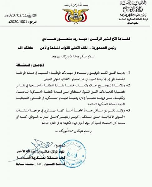 ونشرت المصادر نسخة من وثيقة بعثها هاشم الاحمر إلى الرئيس هادي مطالباً اياه بصفته رئيس القائد الاعلى للقوات المسلحة بقبول استقالته من منصبه في قيادة المنطقة العسكرية السادسة.