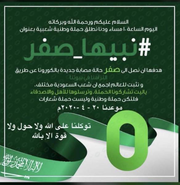 اطلق نشطاء مواقع التواصل الاجتماعي في المملكة العربية السعودية حملة جديدة مساء اليوم الثلاثاء 7 ابريل 2020، تحمل وسم #نبيها_صفر، وذلك بهدف المساهمة في القضاء على فيروس كورونا في البلاد.