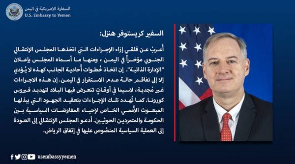 وأعرب السفير الأمريكي لدى اليمن عن قلقه إزاء الإجراءات التي اتخذها المجلس الانتقالي الجنوبي مؤخراً في اليمن، ومنها ما أسماه المجلس بإعلان “الإدارة الذاتية”.