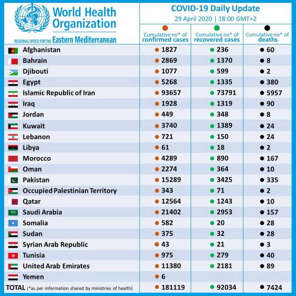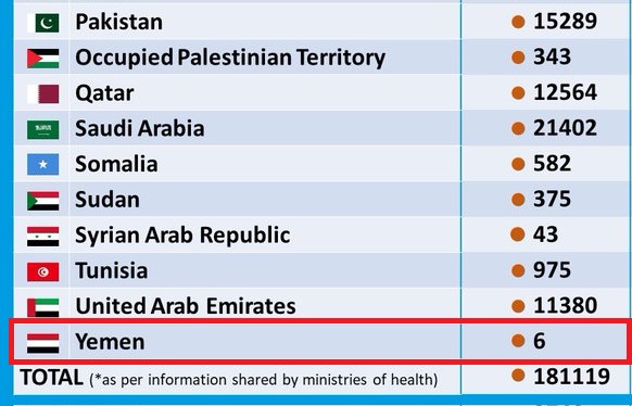 اضافت منظمة الصحة العالمية في اخر تحديث لها قامت بنشره على صفحتها بتويتر اليوم الاربعاء 29 ابريل 2020، خمس حالات اصابة باليمن بجانب الحالة الوحيدة التي سجلت في حضرموت.