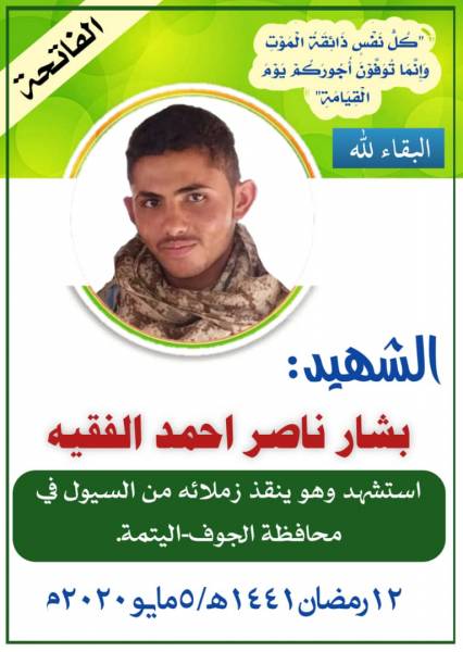 وأشار وكيل المحافظة في اتصاله الذي أجراه بعم الفقيد إلى التضحية التي قدمها الشهيد بشار الذي وافته المنية وهو يقوم بإنقاذ زملائه اثناء تعرضهم للسيول في منطقة اليتمة بمحافظة الجوف.