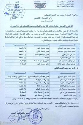 وجاء في الوثيقة أن ستة اشخاص بينهم اربعة مدراء مدارس ومسؤولين في مكتب التربية والتعليم بمديرية “بلاد الطعام” لقوا مصرعهم فيما أصيب سبعة آخرين من مسؤولي التربية في محافظة ريمة بينهم مدير عام التربية والتعليم في “ريمة” حميد قاسم صالح التوعري والذي ينتمي إلى منطقة “خولان الطيال.