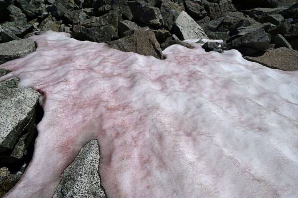 في إيطاليا يحقق بعض العلماء، في ظاهرة غامضة تمثلت بظهور ثلج جليدي زهري في جبال الألب بسبب طحالب تسرّع تبعات التغير المناخي.