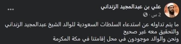 وأضاف علي الزنداني ” نحن والوالد موجودون في محل إقامتنا في مكة المكرمة”.