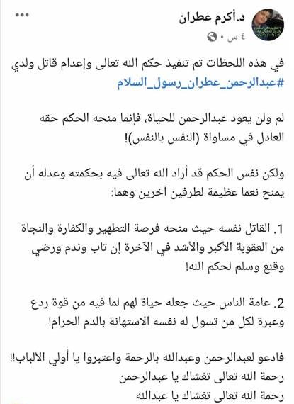 وأعلن والد الطفل الدكتور أكرم عطران في منشور على الفيسبوك، انه تم تنفيذ حكم الإعدام، وترحم فيه على الجاني وابنه القتيل.