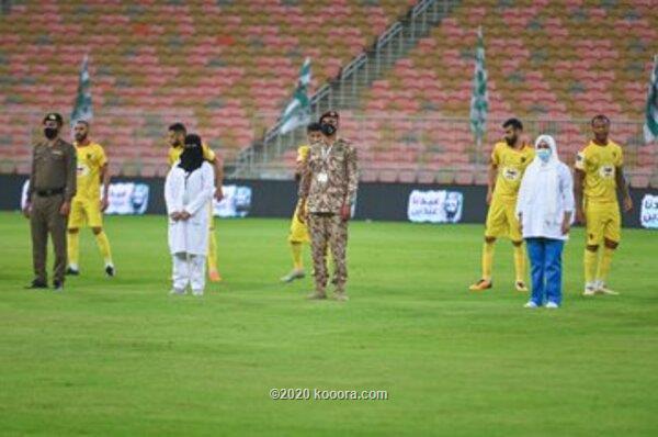 وقبل انطلاق مباراة الأهلي والحزم، أقام اللاعبون وطاقم التحكيم، ممرا شرفيا لأبطال الصحة والأمن؛ تقديرًا لجهودهم الكبيرة في التصدي لجائحة فيروس كورونا.