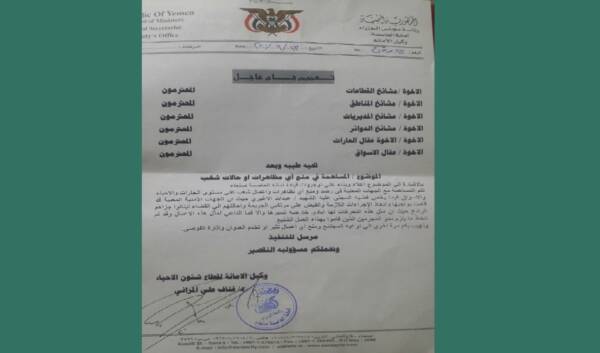 وظهر ذلك الفزع الحوثي في شكل تعميم موجه لكافة عقال ومشايخ الاحياء والحارات والاسواق بصنعاء، بمنع أي تظاهرات أو أعمال شغب بشان قضية المجني عليه عبدالله الاغبري.