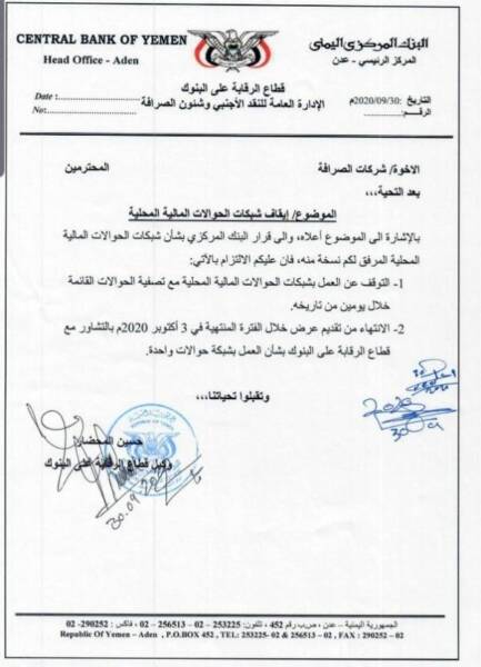 أصدر البنك المركزي اليمني في العاصمة المؤقتة عدن، قرارا قضي بإيقاف العمل بشبكات الحوالات المالية المحلية، وألزم شركات الصرافة بتصفية الحوالات القائمة خلال يومين من اليوم الأربعاء، 30 سبتمبر.