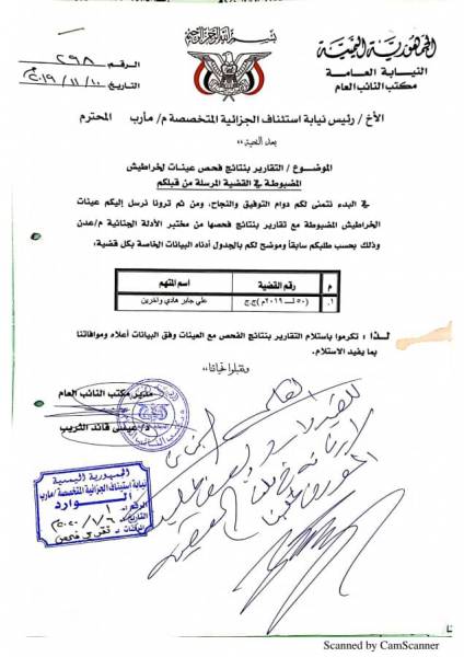 واثبت المعمل الجنائي في عدن الظروف الفارغة التي وجدت بجوار المقتول اطلقت من البندقية المضبوطة التابعة للمذكورين انفا.
