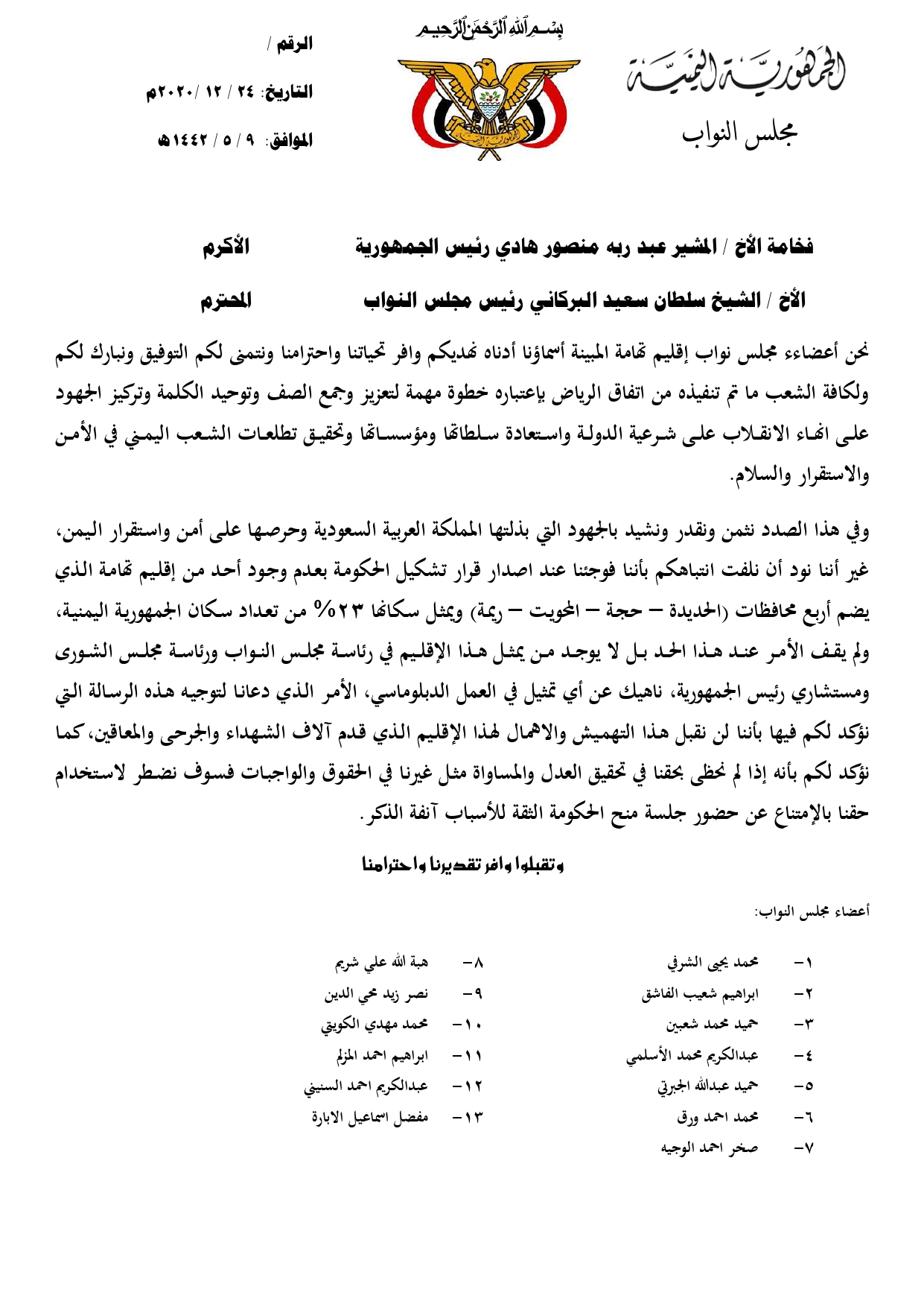 اسماء النواب الموقعين على الرسالة: