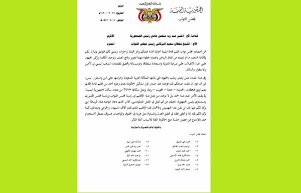 جاء ذلك في رسالة وجهها النواب إلى الرئيس اليمني عبدربه منصور هادي، ورئيس البرلمان سلطان البركاني، أمس الخميس.