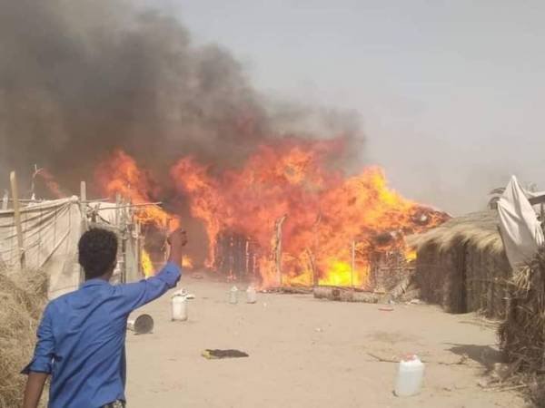التهم حريق كبير 18 خيمة في مخيم للنازحين في مديرية الخوخة بمحافظة الحديدة.