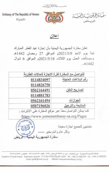 أعلنت سفارة الجمهورية اليمنية بالرياض موعد إجازة عيد الفطر المبارك.