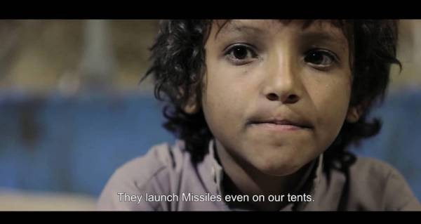 وقال المركز أن الطفل يروي خلال سبع دقائق معاناته جراء النزوح، وتعبه من العيش في الخيمة التي يسكنها في مخيم الجفينة، بعد أن كان يعيش حياة هانئة في قريته بمحافظة حجة.