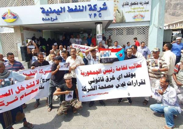 واليوم الأحد، نظم العشرات من موظفي شركة النفط بعدن، وقفة احتجاجية أمام مبنى الشركة، مطالبين محافظ عدن أحمد لملس، بالتراجع عن القرار الذي أصدره بتعيين صالح الجريري مديرا عاما للشركة.