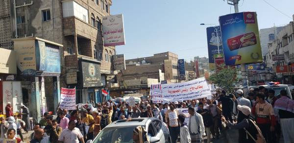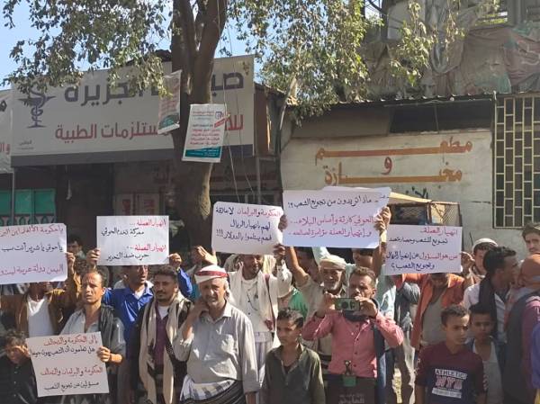 وشهدت شوارع مدينة تعز، مظاهرات للمئات من المواطنين المنددين بتردي الخدمات وتراجع العملة المحلية أمام العملات الأجنبية.