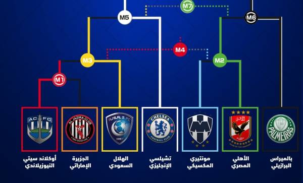 ويقع تشيلسي الإنجليزي بطل أوروبا في طريق الفائز من مواجهة الهلال مع الصاعد من لقاء الجزيرة وأوكلاند.