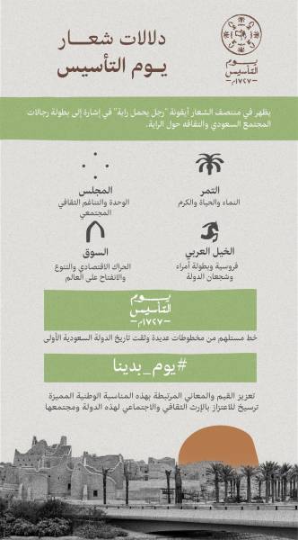 وأصدرت المملكة هوية بصرية مميزة ليوم التأسيس تحت شعار “يوم بدينا” يظهر في منتصفه أيقونة رجل يحمل راية في إشارة إلى “بطولة رجالات المجتمع السعودي والتفافه حول الراية التي حماها”.