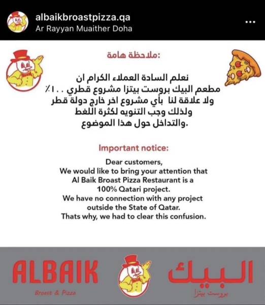 وأشار البعض إلى أن مطعم البيك في قطر لا يحمل نفس الاسم، إذ أن اسمه “البيك بروستد بيتز” كما أن الشعار مختلف قليلا.