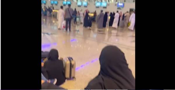 وظهر في الفيديو أحد المسافرين في صالة الانتظار بمطار جدة ممسكاً بشماغه وعقاله في يده ويلوح بيده ويقول بصوت مرتفع وغاضب : ” من الساعة 8 ما أحد يعبرنا ولا أحد يقول لنا شي كذابين “.
