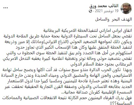 وكشف ورق في منشور سابق له على فيسبوك عن اتفاق إيراني إماراتي لتنفيذ هذا المخطط، مؤكداً أن انسحاب القوات من الحديدة تجاوز حدود اتفاق استكهولم لتمهيد الطريق لتنفيذ هذا المخطط.