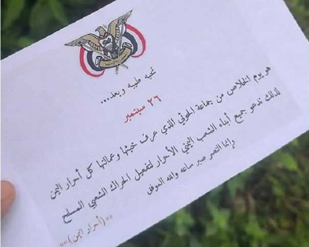 وذكرت مصادر محلية أن المنشورات، التي حملت توقيع كيان يطلق على نفسه اسم “أحرار اليمن”، انتشرت بشكل سري في المناطق الخاضعة لسيطرة الحوثيين، داعية المواطنين للخروج في تحرك مسلح ضد الجماعة بالتزامن مع الذكرى الـ62 لثورة 26 سبتمبر.