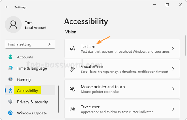 2- الانتقال إلى فئة “إمكانية الوصول” في الشريط الجانبي الأيمن، ثم النقر على خيار “حجم النص”.