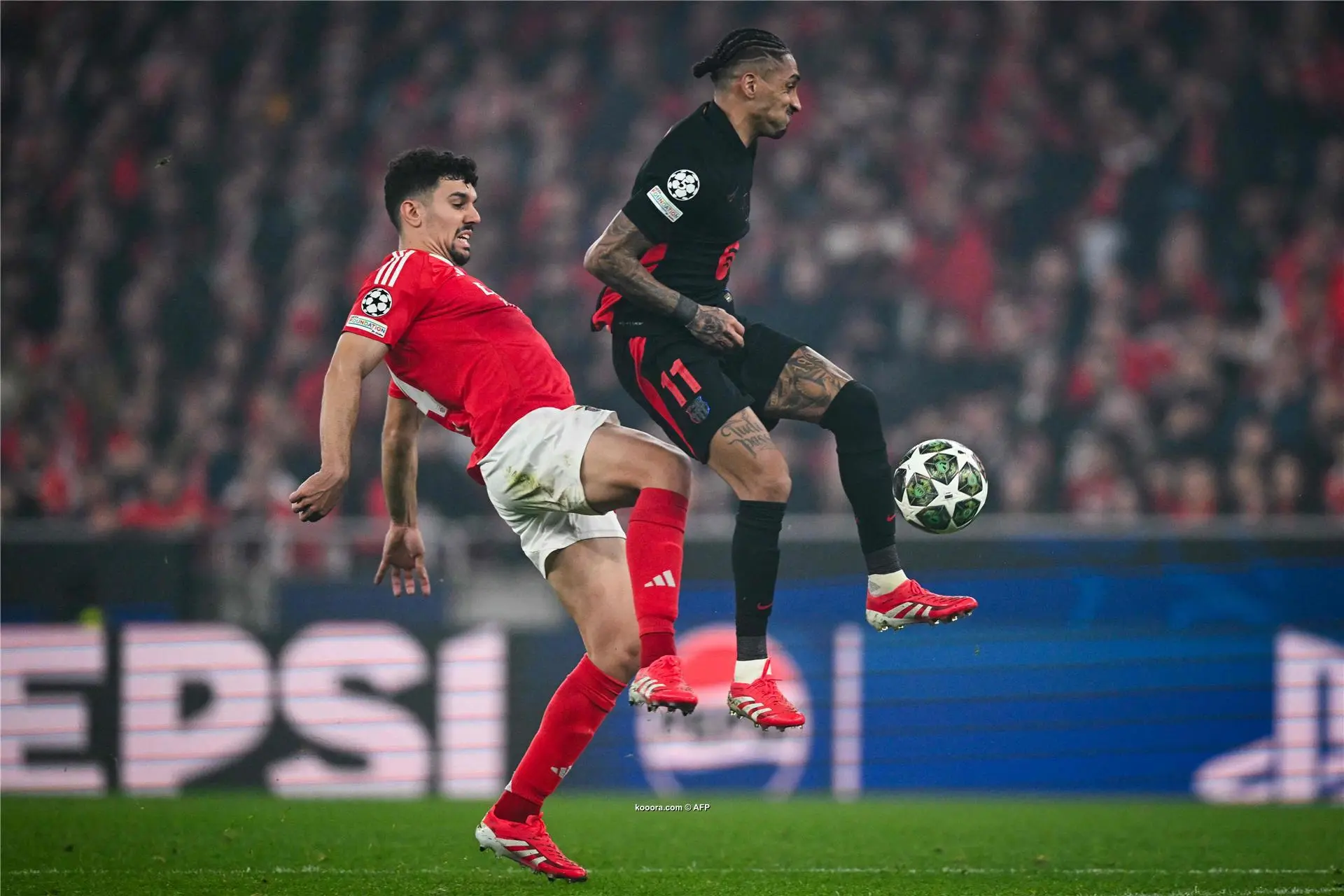 واضطر مدرب برشلونة، هانز فليك، لإجراء تغيير اضطراري، فأشرك رونالد أراوخو بدلاً من داني أولمو لتعزيز الدفاع. وتوقفت المباراة لفترة وجيزة بسبب إشعال جماهير بنفيكا للألعاب النارية.