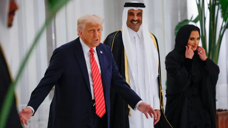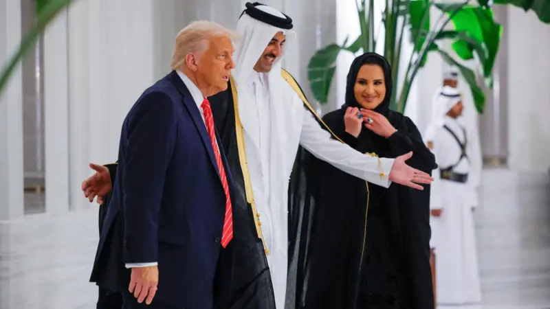 تصدّرت صورٌ للأمير الشيخ تميم بن حمد آل ثاني وزوجته الشيخة جواهر بنت حمد بن سحيم آل ثاني، وهما يستقبلان الرئيس الأمريكي دونالد ترامب، مواقع التواصل الاجتماعي.